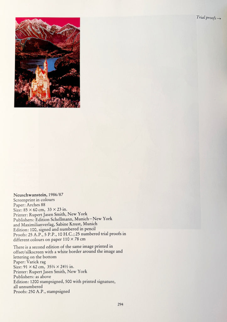 Andy Warhol "Neuschwanstein" 1987. Offset lithograph & silkscreen on varick rag. The second edition of Neuschwanstein, jointly published by Edition Schellmann, Maximilian Verlag & Sabine Knust. Printed in 1987 by Andy Warhols 'Master Printer' Rupert Jasen Smith. Bearing the printers 'S' blind stamp/embossment mark. Edition of 1200 + 250AP. Printed signature, lower left.