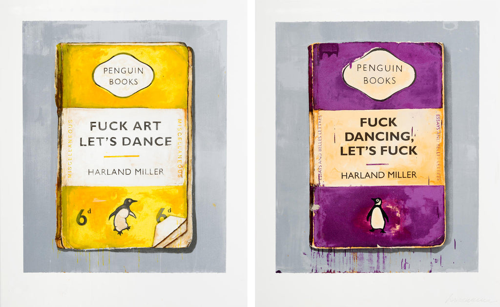 Harland Miller "Fuck Art Let's Dance" Diptych. Including "Fuck Dancing Let's Fuck". Two silk screen prints on Somerset satin tub sized 410gsm. Edition of 50.