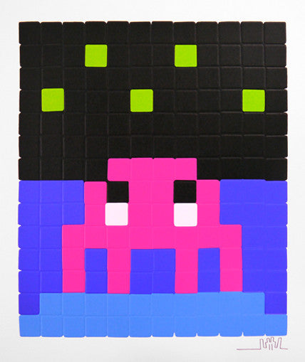 Invader "Pink Space One" original 5 colour hand pulled embossed screen print, foiled white eyes on Somerset Satin White 300 gsm. Produced by Pictures on Walls (POW) in 2013. This series is limited to 70 pieces.